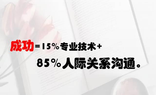 美国著名的教育学家卡耐基讲过:一个人的成功,只有15%是你的专业技术,而85%要靠我们的人际关系沟通和与他人做事处世的这种能力。