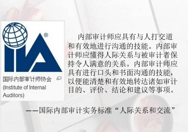 在国际上,国际内部审计实务标准当中有这方面的要求和标准,在《人际关系和交流》当中已经指出:内部审计师应该具有与人打交道和有效的进行沟通的这种技能,内部审计师应该懂得人际关系与被审计者保持令人满意的关系,内部审计师应该具有口头和书面沟通的技能,以便能清楚和有效的传达诸如说审计目的审计评价、审计结论和审计建议等有关事项。