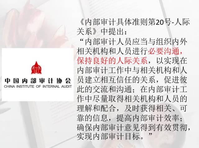中国内部审计具体准则第20号《人际关系》当中也指出:内部审计人员应当与组织内外相关机构和人员进行必要的沟通保持良好的人际关系,以实现在内部审计工作当中与相关机构和人员建立相互信任的关系,促进彼此的交流和沟通。在内部审计工作当中尽量取得相关机构和人员的理解和配合,及时获得相关可靠的信息来提高我们内部审计工作的效率,确保我们内部审计的意见得到有效贯彻,最终实现内部审计的目标。